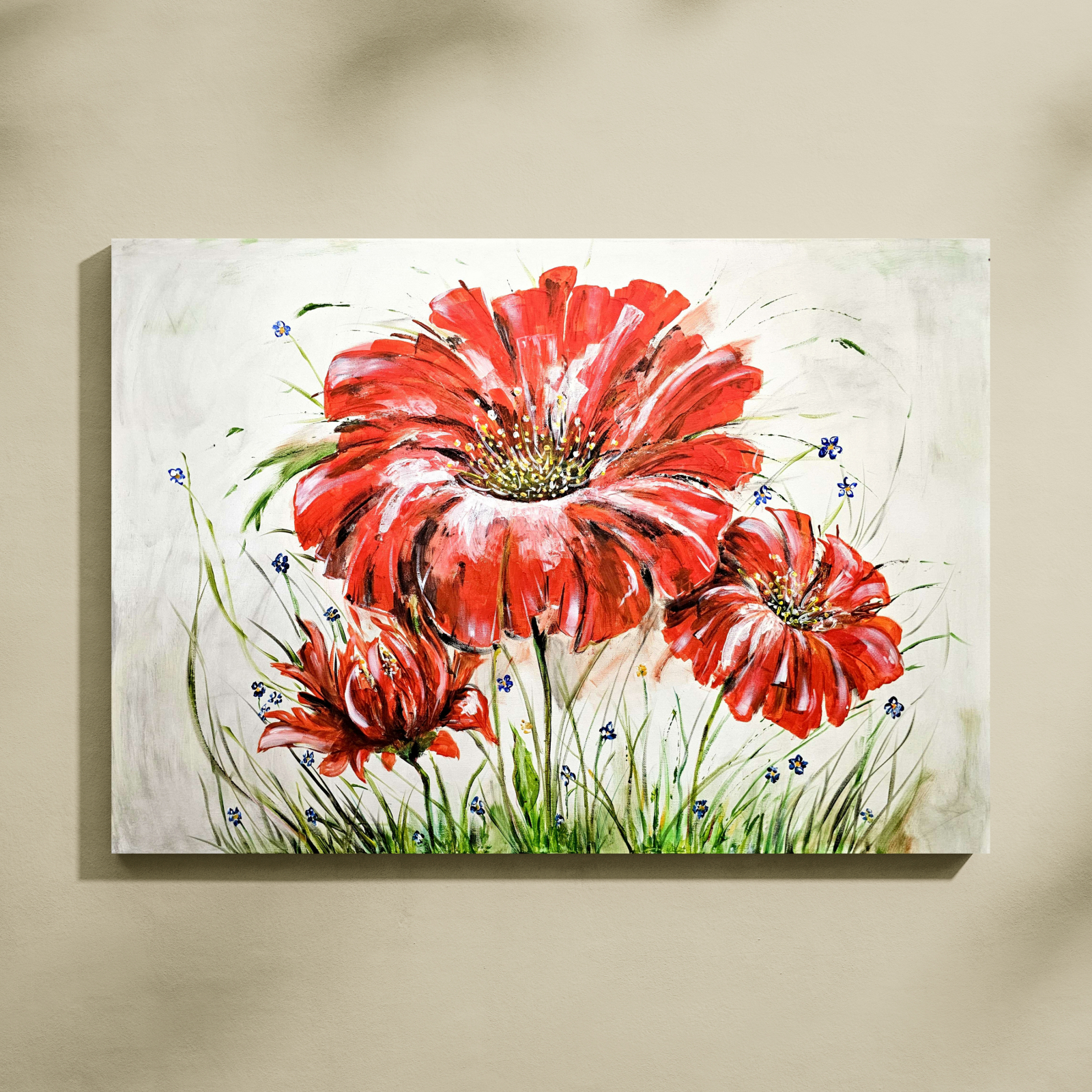 Adaugă o notă de rafinament și vitalitate spațiului tău cu acest tablou pictat manual cu flori roșii, realizat în acrilic pe pânză, în format mare (70x100 cm). Lucrarea este unicat, pictată cu grijă de artist, și surprinde dinamismul și eleganța florilor în nuanțe vibrante de roșu, accentuate de detalii fine în verde și albastru.